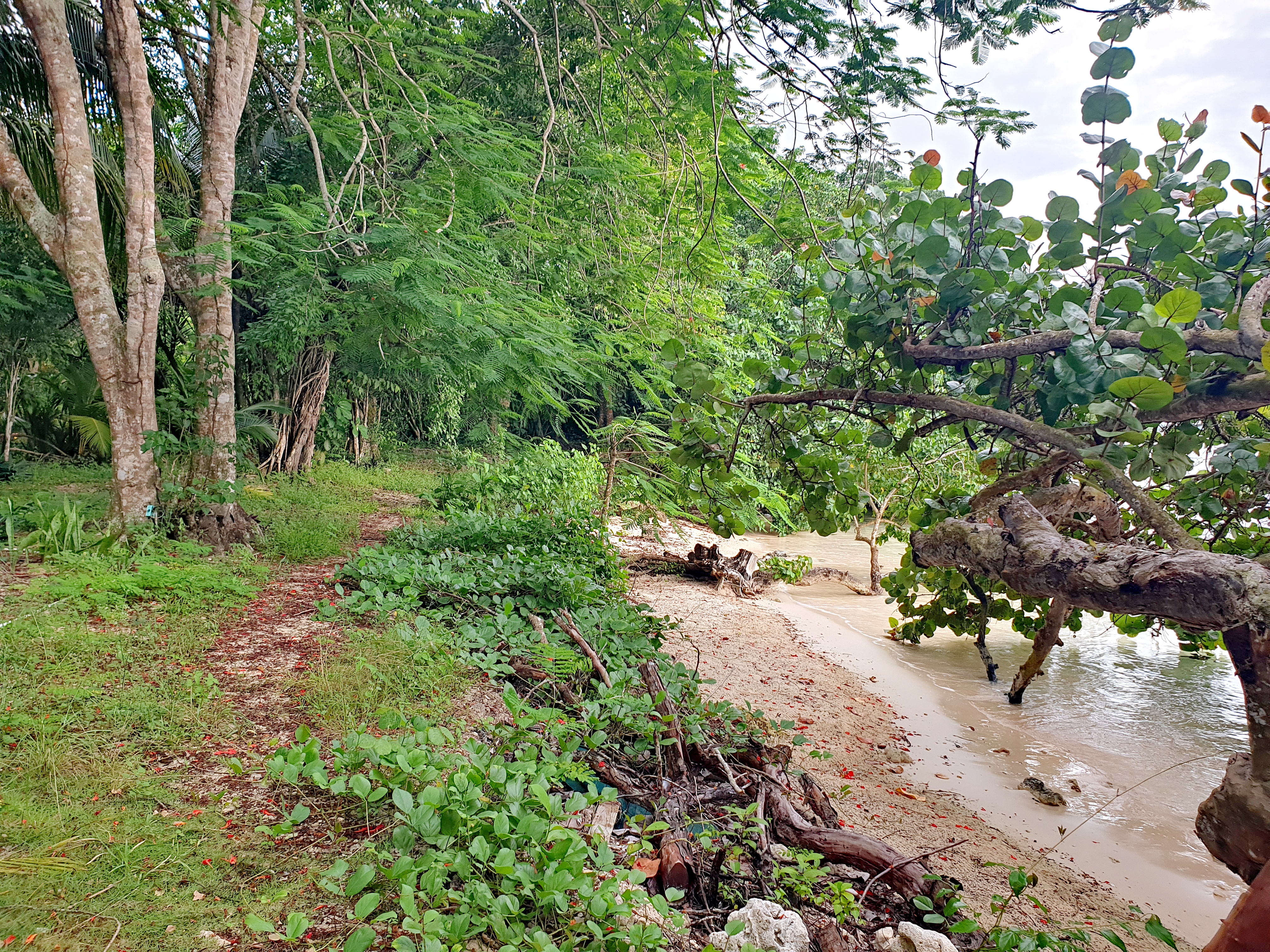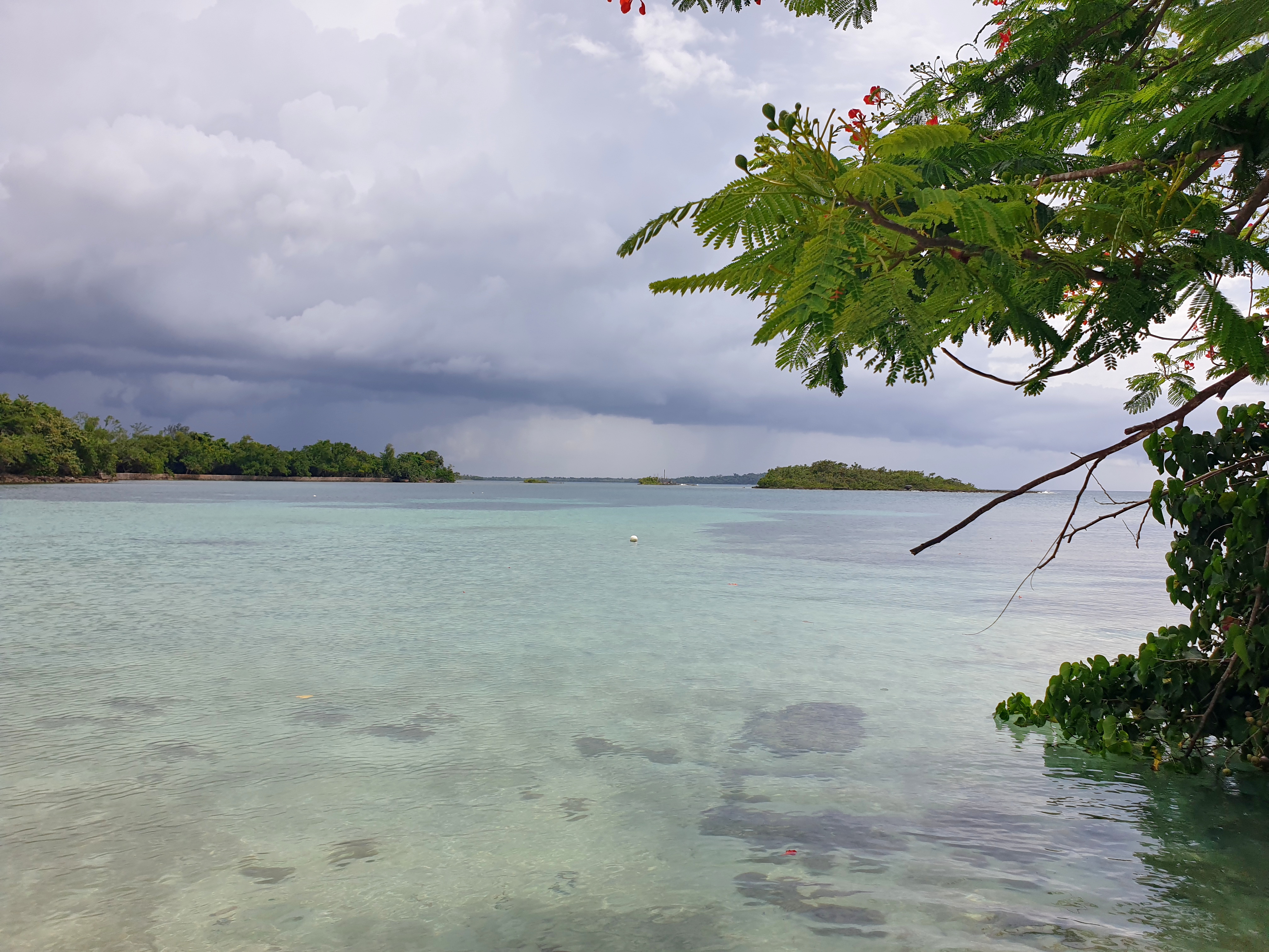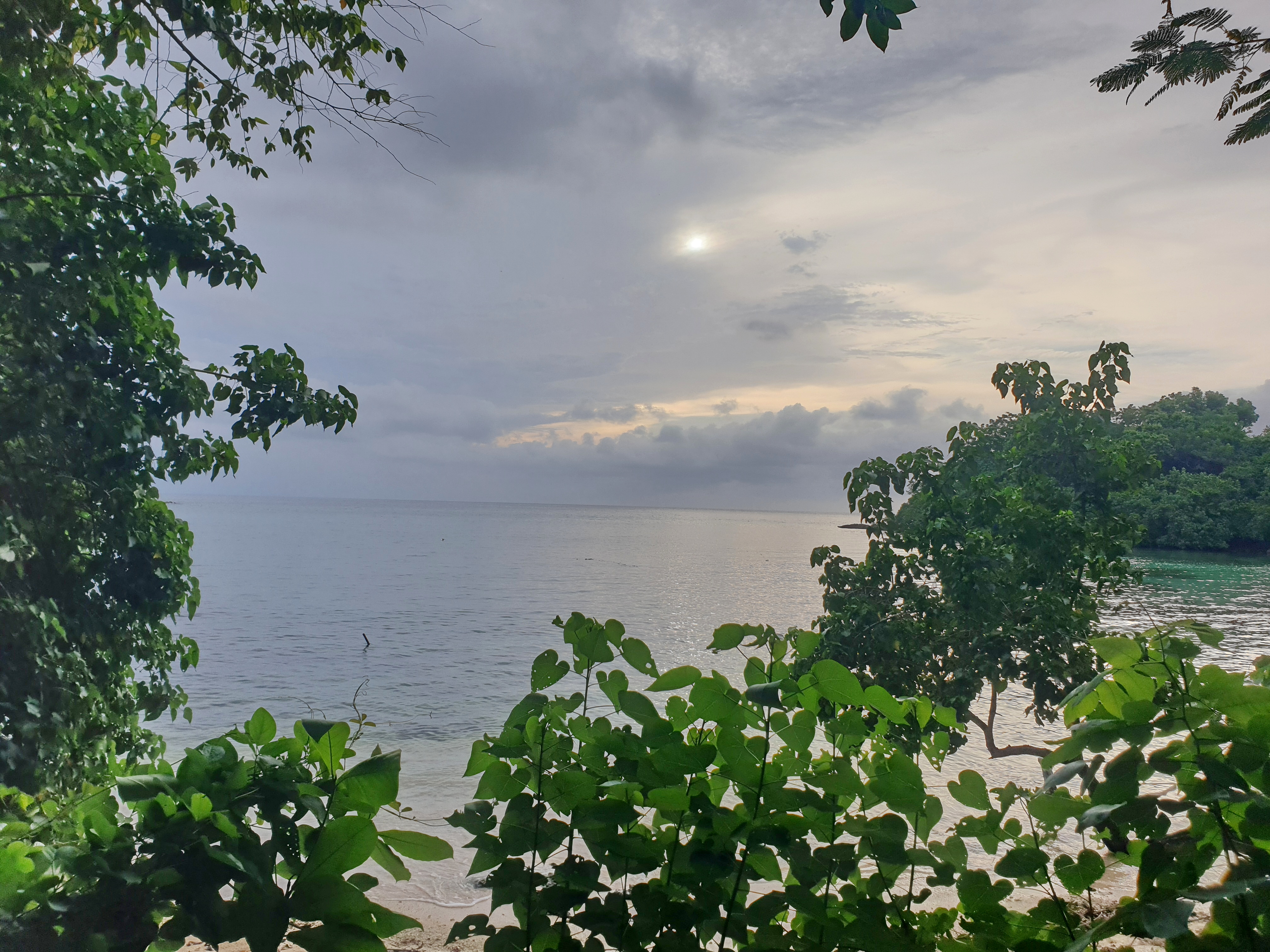 Левый берег под веткой дерева — это край нашей бухты. Почти по центру — остров. Чуть левее острова — наш материк (точнее остров, Ямайка же остров). За этим зелёным холмом на горизонте начинается северная часть 7 Mile Beach. Как раз там сейчас гроза и молнии. Мы же наслаждались светопредставлением и гадали, дойдёт ли это всё до нас. В этом случае нам пришлось бы перебраться на крытую веранду кафе.