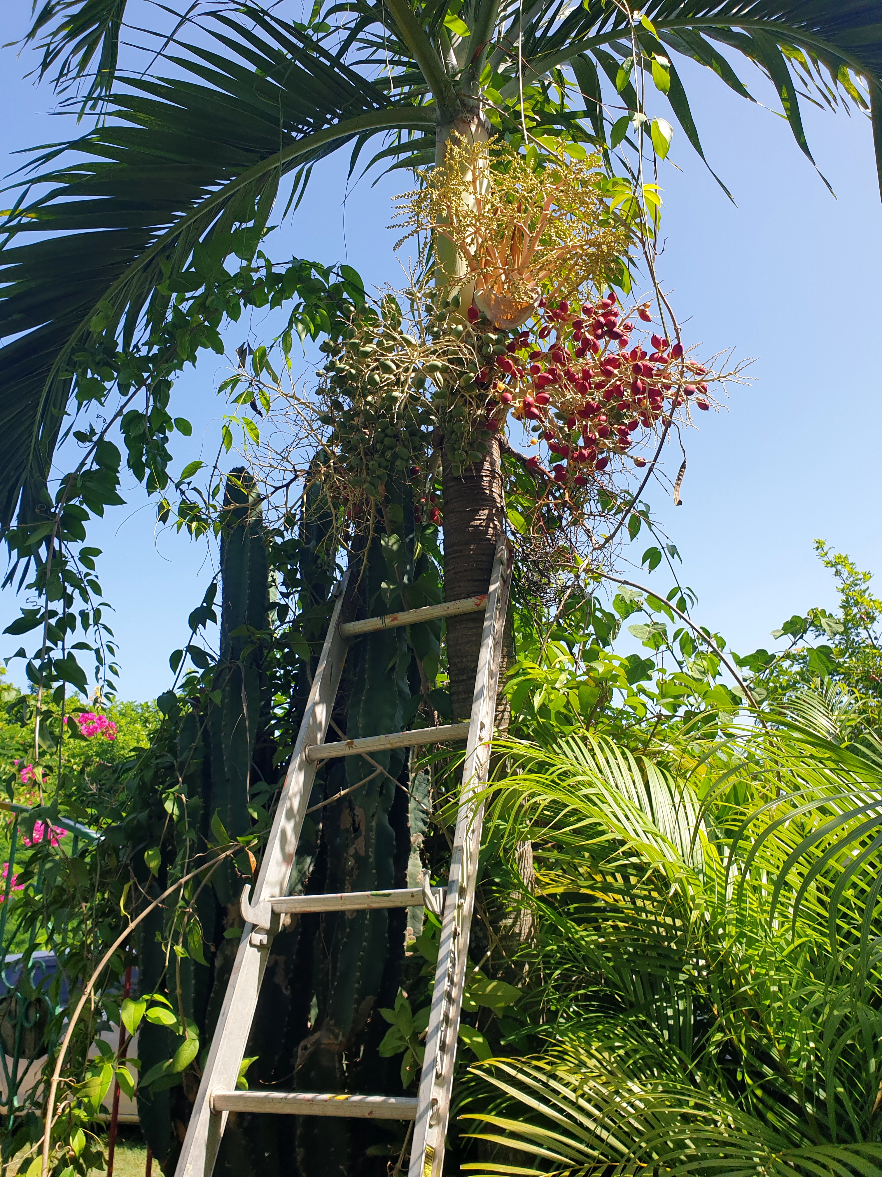 По дороге заметил лестницу у пальмы с красными плодами: