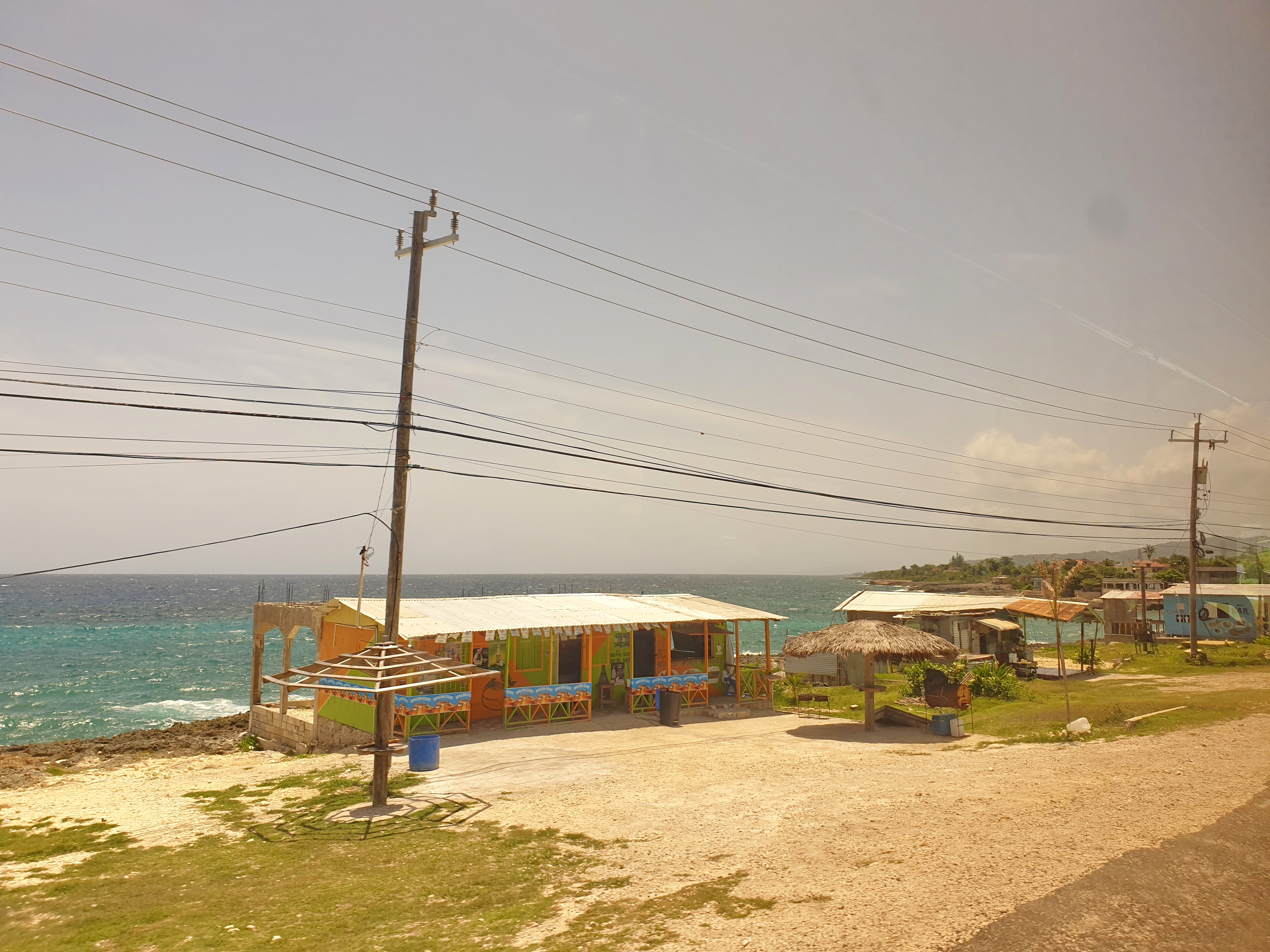 В этот раз в хвосте автобуса была компания с беспроводной колонкой. Компания была среднего возраста, музыка не громкая и, на моё удивление, религиозная. Тут стоит уточнить, что значит “религиозная музыка”. Как я уже писал, большинство людей на Ямайке — христиане, а точнее протестанты. В отличие от православия, в протестантской церкви музыка и песни являются частью церковной службы (обряда). Значит, есть песни и музыкальные группы, которые их исполняют. И ничто не мешает человеку в свободное время послушать такую музыку вместо рок-н-ролла или умца-умца (или послушать всё вместе). Я не люблю, когда в общественных местах слушают музыку не через наушники, но в данном случае мне было интересно наблюдать за происходящим. Я заметил, что некоторые люди, сидящие в противоположном конце автобуса, тоже знали слова и иногда тихо подпевали или просто шевелили губами. Например, отец парня в голубой футболке, сидящий ко мне лицом. И другие кивали головой в такт музыки. Я хотел сфотографировать сидящих в хвосте автобуса и спросил разрешения, но, к сожалению, они не согласились.Я продолжил делать фотографии из окна автобуса: