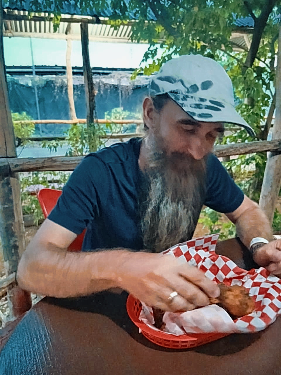 На фотографии очень светло, но на самом деле был вечер, и довольно тусклое освещение.Jerk Chicken — это курица, приготовленная на углях по особому ямайскому рецепту. История рецепта ведёт к Маронам — беглым рабам, скрывавшимся в труднодоступных горных районах острова и использовавшим местные приправы. Они, в свою очередь, заимствовали этот рецепт джеркинга у племён Таино, которые жили на Ямайке ещё до колонизации.