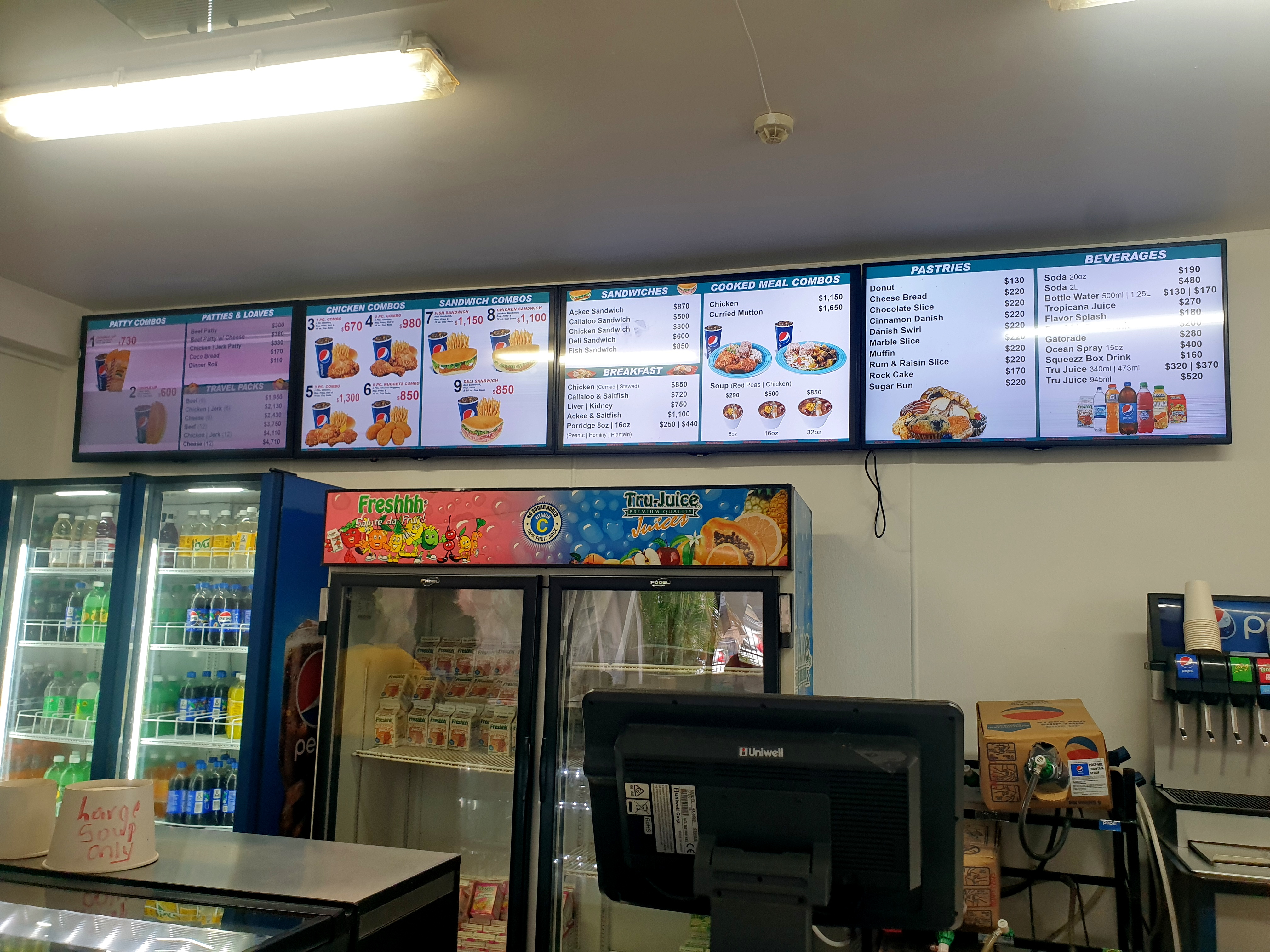 В меню есть много знакомого и понятного, но я здесь в первую очередь ради Пати (Jamaican patty) или, по версии Википедии, — ямайский пирожок. В меню на фото это самый незаметный левый экран. Не пугайтесь цен — это ямайские доллары (160 ямайских долларов — это примерно 1 американский, или поделите все на 2 и получите цену в рублях (по курсу на сегодня)).Короче, это ямайские чебуреки, но, конечно, со своими специями и рецептами. На мой вкус лучше всего вариант “Говядина с сыром” — начинка не такая сухая, и сыр немного уменьшает остроту.
