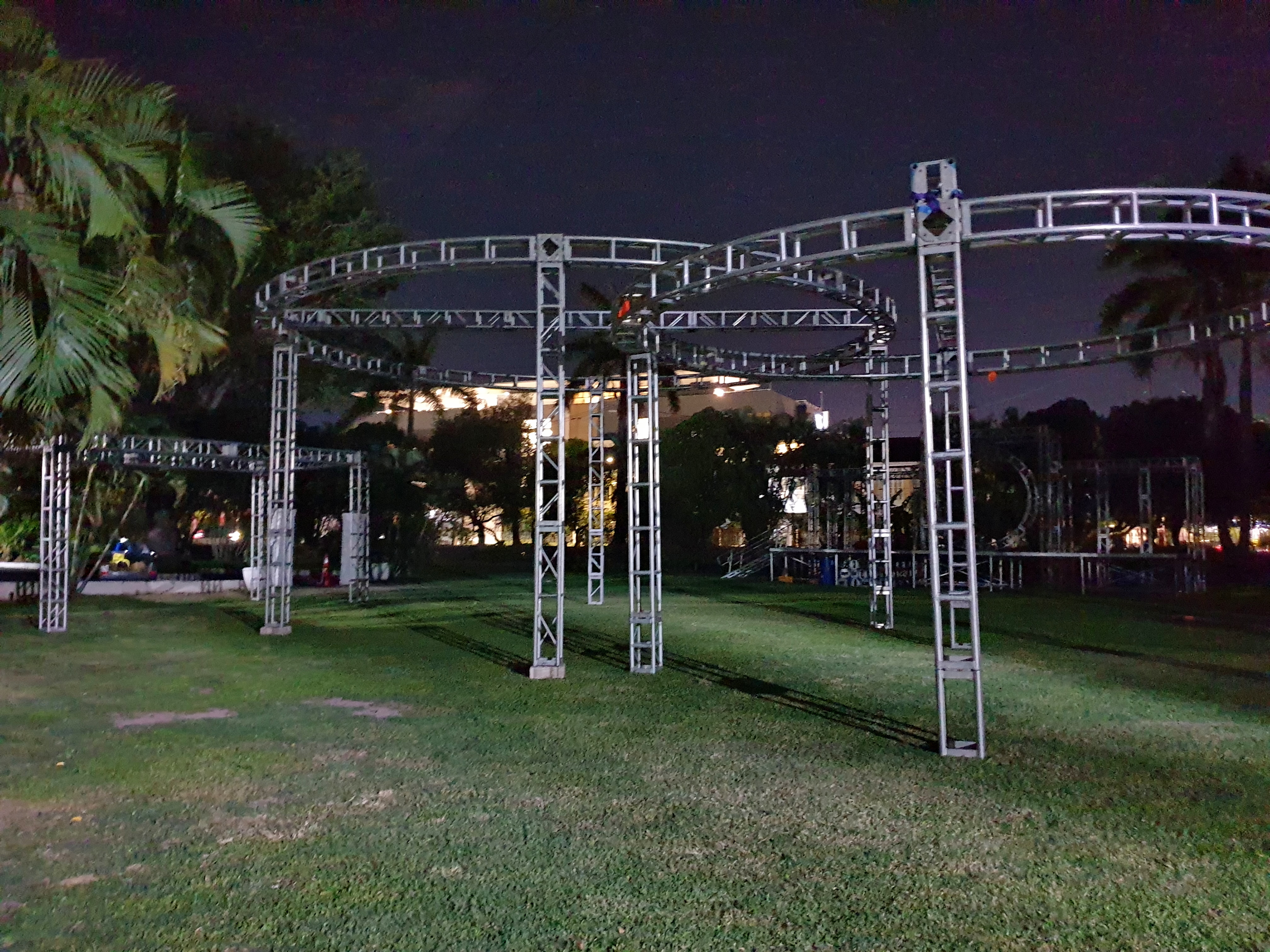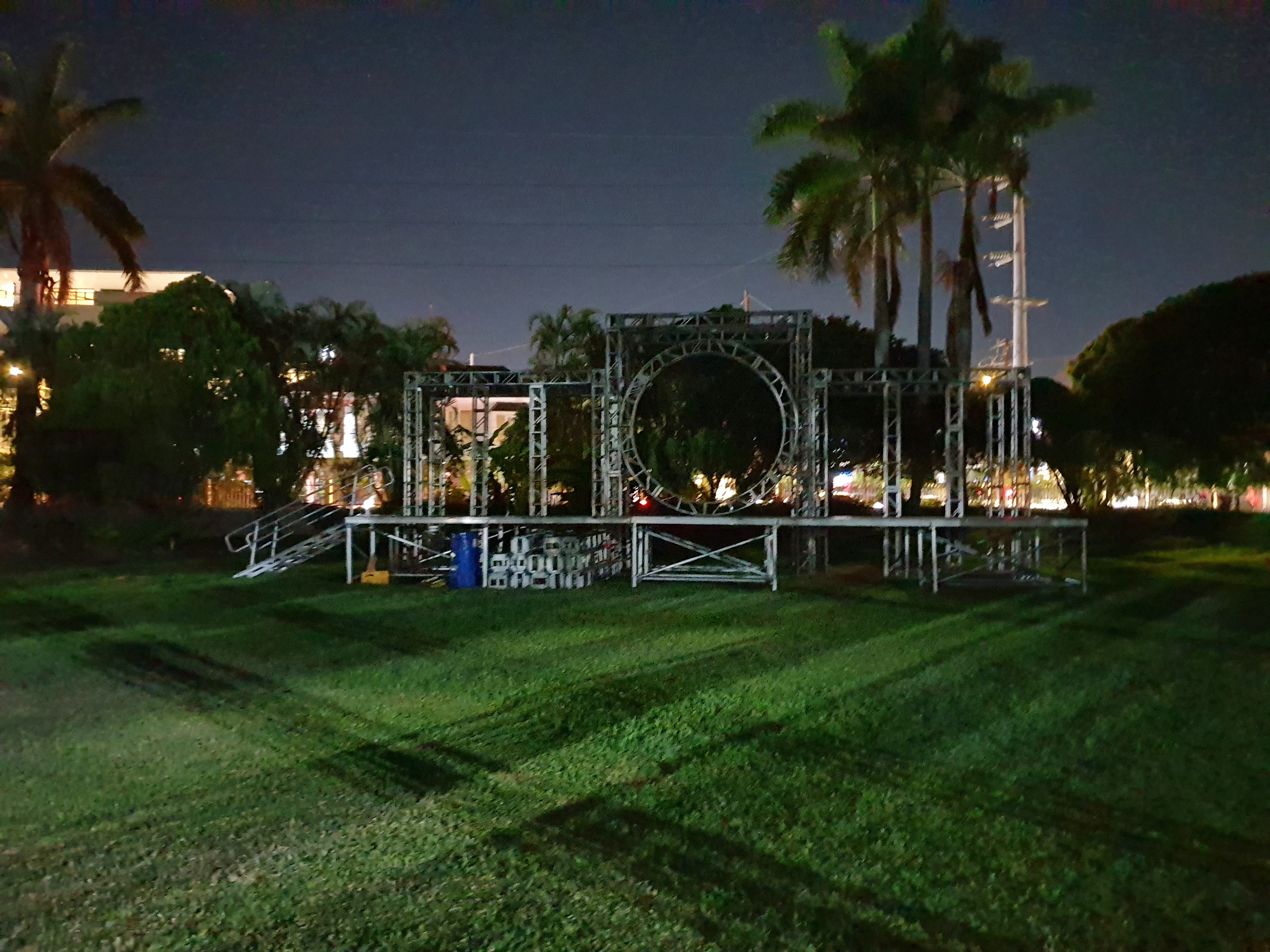 Буквально позади здания стояли металлические конструкции для светового и звукового оборудования:
